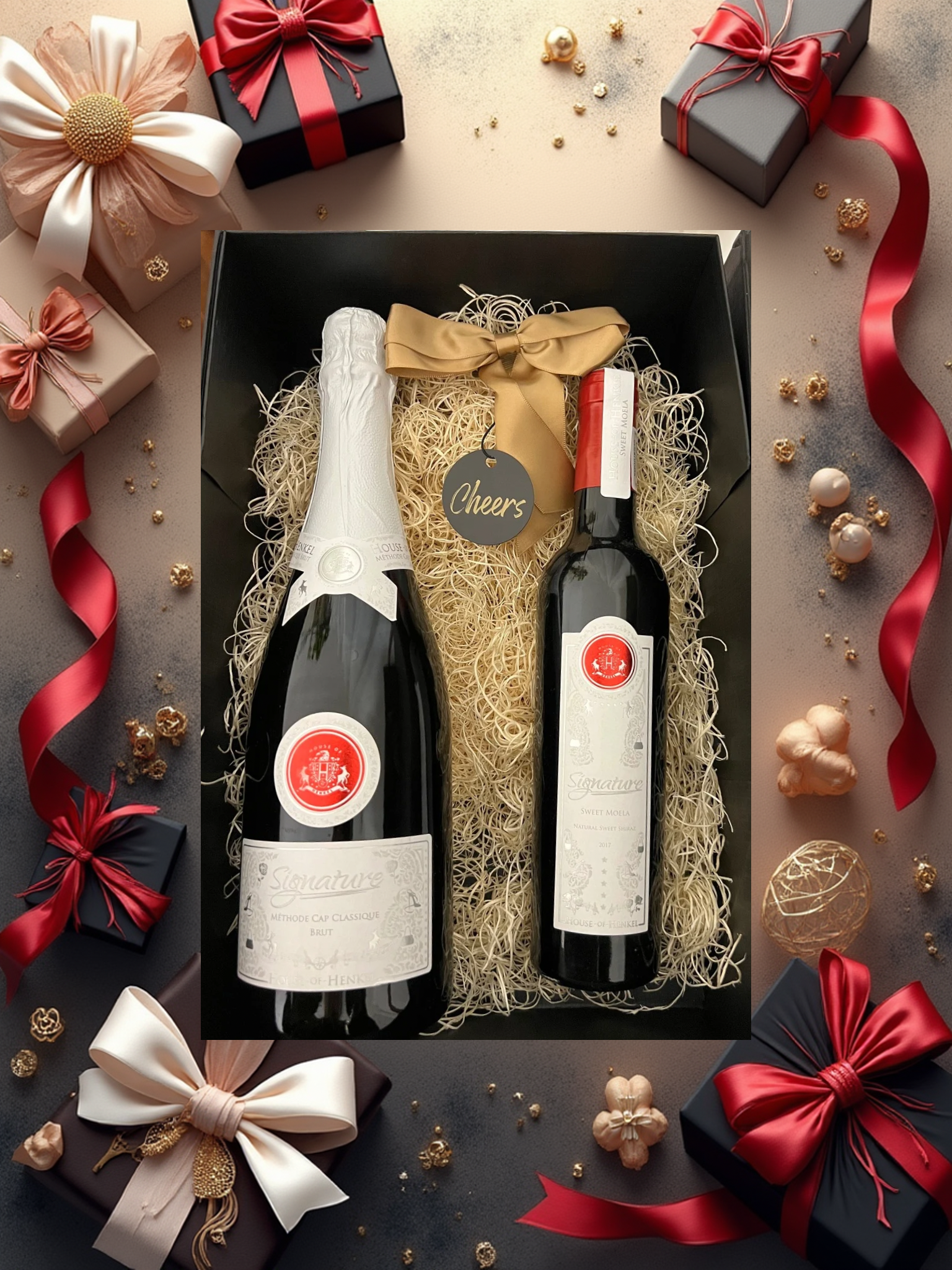 Celebrate life’s most memorable moments with the Signature Celebration Box, a beautifully curated two-bottle gift set from House of Henkel. This collection blends sophistication with sentiment—pairing the elegance of our Méthode Cap Classique with the heartwarming story and rich flavor of our Sweet Moela Natural Sweet Shiraz.